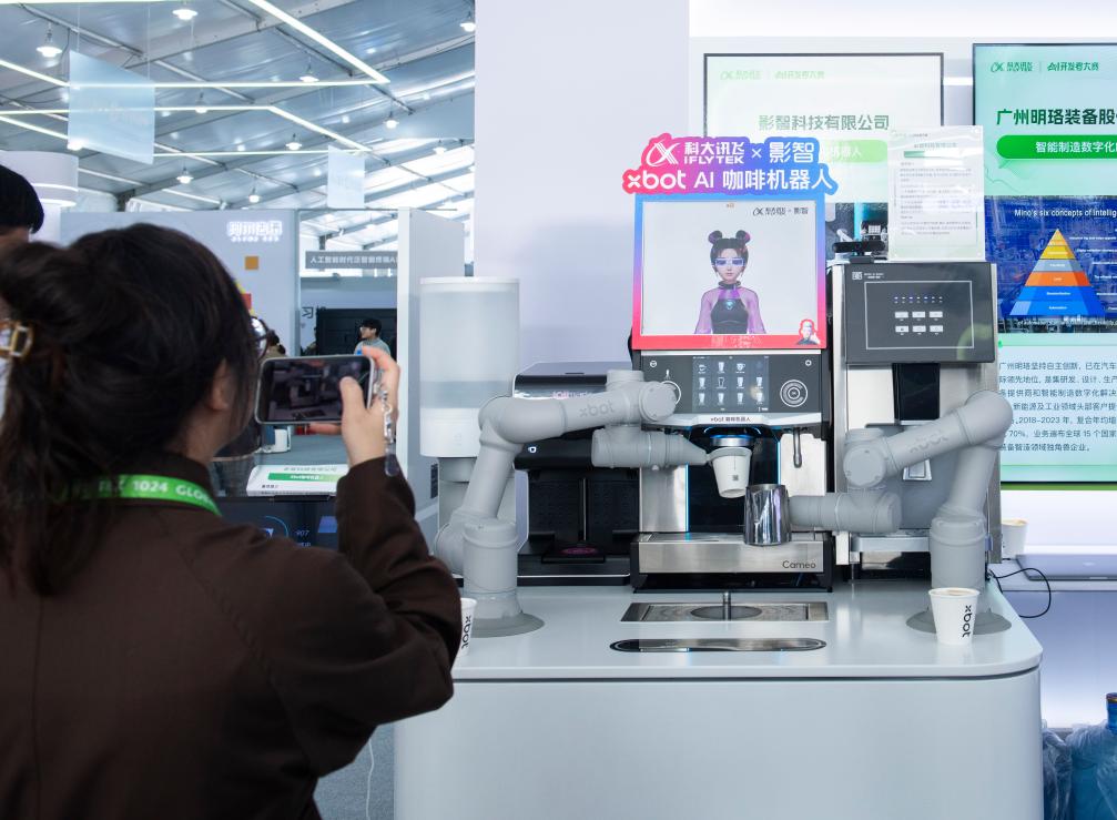 在第七屆世界聲博會(hui) 上展出的AI咖啡機器人。新華社記者 傅天 攝