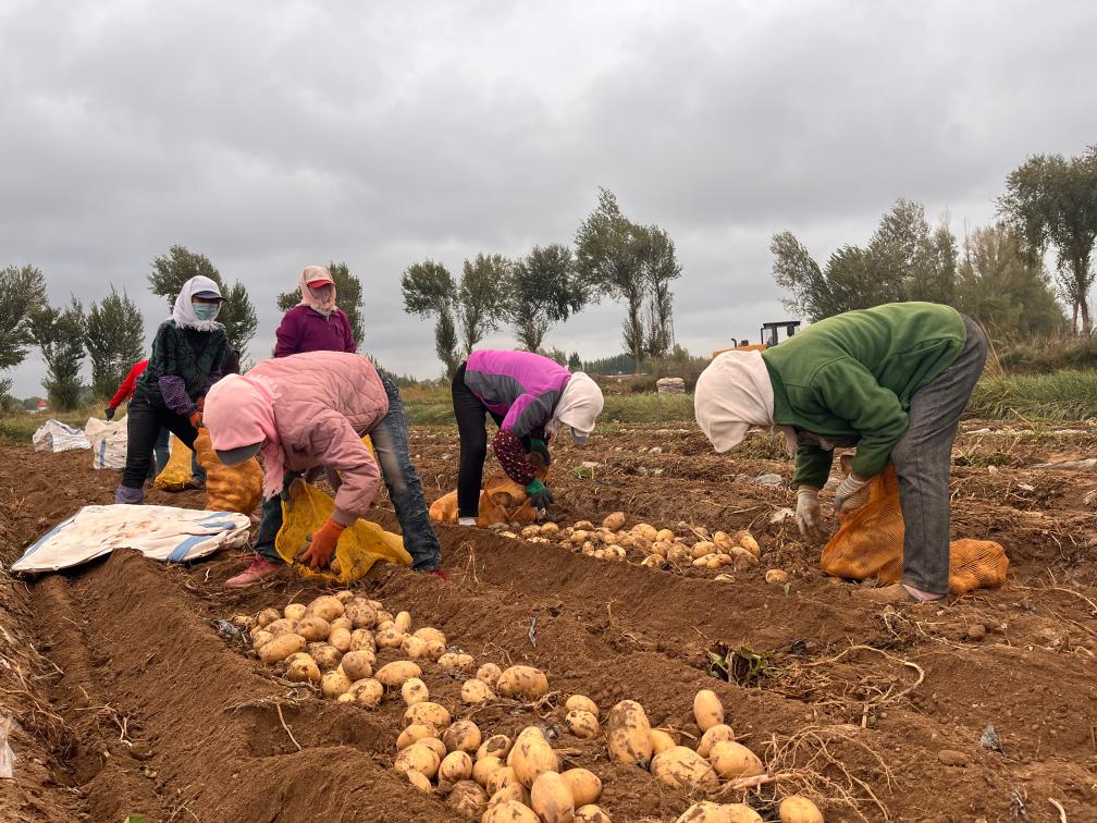 在甘肅省張掖市山丹縣甘農(nong) 薯7號綠色標準化連片示範基地裏,村民正在撿收馬鈴薯。(受訪者供圖)
