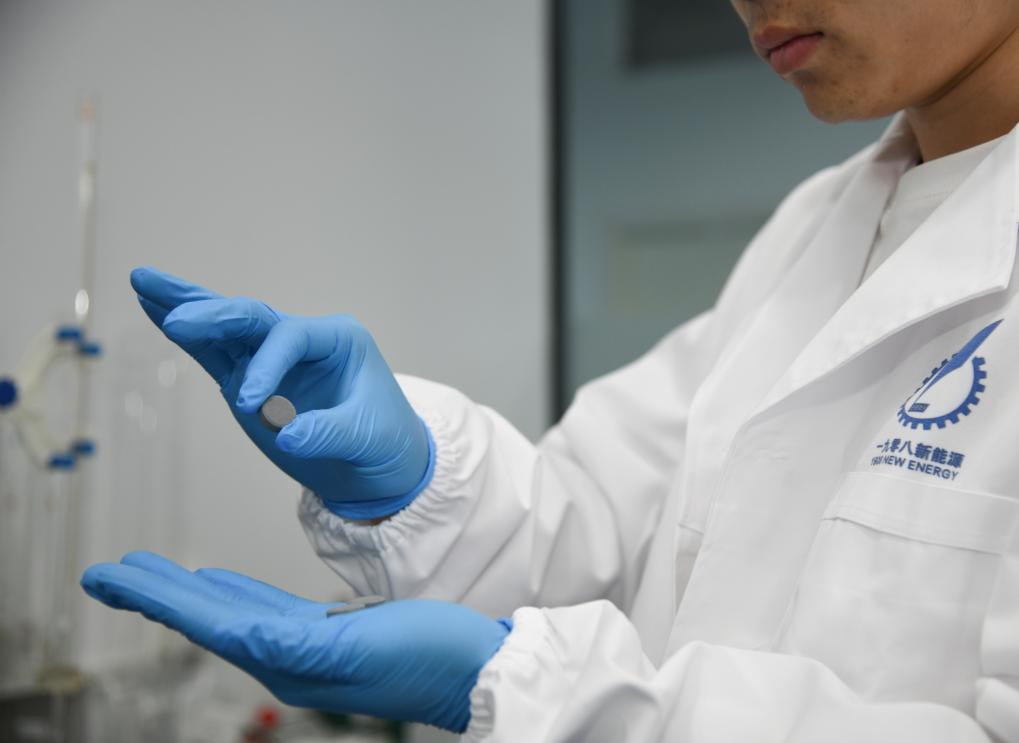 西安一九零八新能源科技有限公司科研人員在展示由其研發的複雜金屬基複合固態儲(chu) 氫材料。新華社記者 張博文 攝