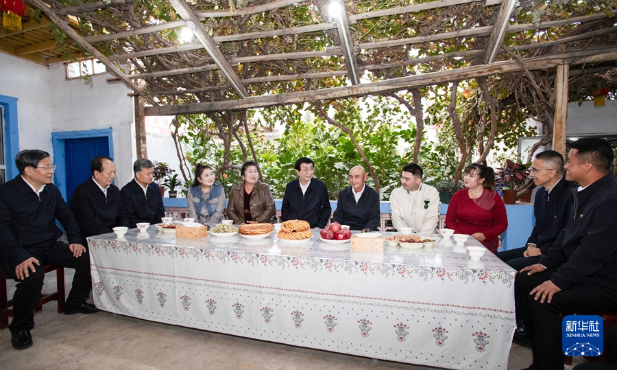 10月21日至24日,中共中央政治局常委、全國政協主席王滬寧在新疆和田、喀什調研。這是23日下午,王滬寧在疏勒縣塔孜洪鄉(xiang) 台吐爾村同幹部群眾(zhong) 交流。新華社記者 李濤 攝
