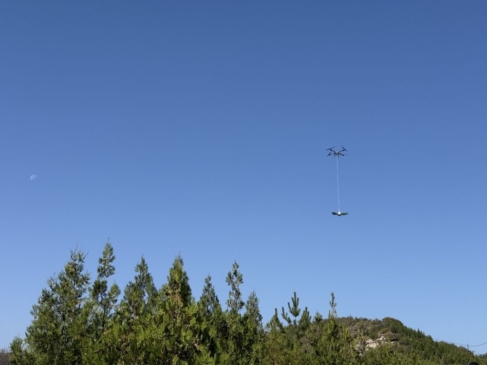 “懸崖造林隊”隊員在操作無人機,將樹苗運到另一側(ce) 山頭。