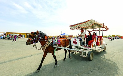 遊客在尉犁縣羅布人村寨乘坐馬車。汪誌鵬攝