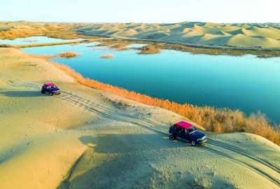 遊客在尉犁縣羅布人村寨體(ti) 驗沙漠越野。汪誌鵬攝