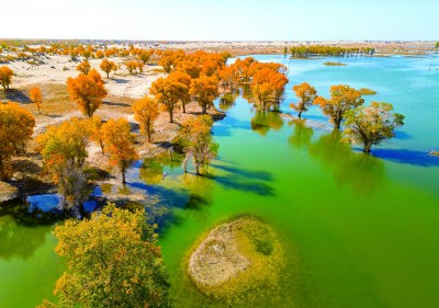 站在高處放眼望去,大片的胡楊林仿佛被溫柔的霞光所籠罩,明黃色的胡楊葉如同滿天繁星,在水麵上輕輕搖曳。走進胡楊林深處,可見漢唐烽燧、太陽墓、祭台,每一處文化遺存都透著原始與(yu) 神秘,仿佛將一個(ge) 個(ge) 古老的傳(chuan) 說向人娓娓道來。