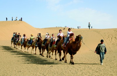 遊客在尉犁縣羅布人村寨東(dong) 沙山騎駱駝。汪誌鵬攝