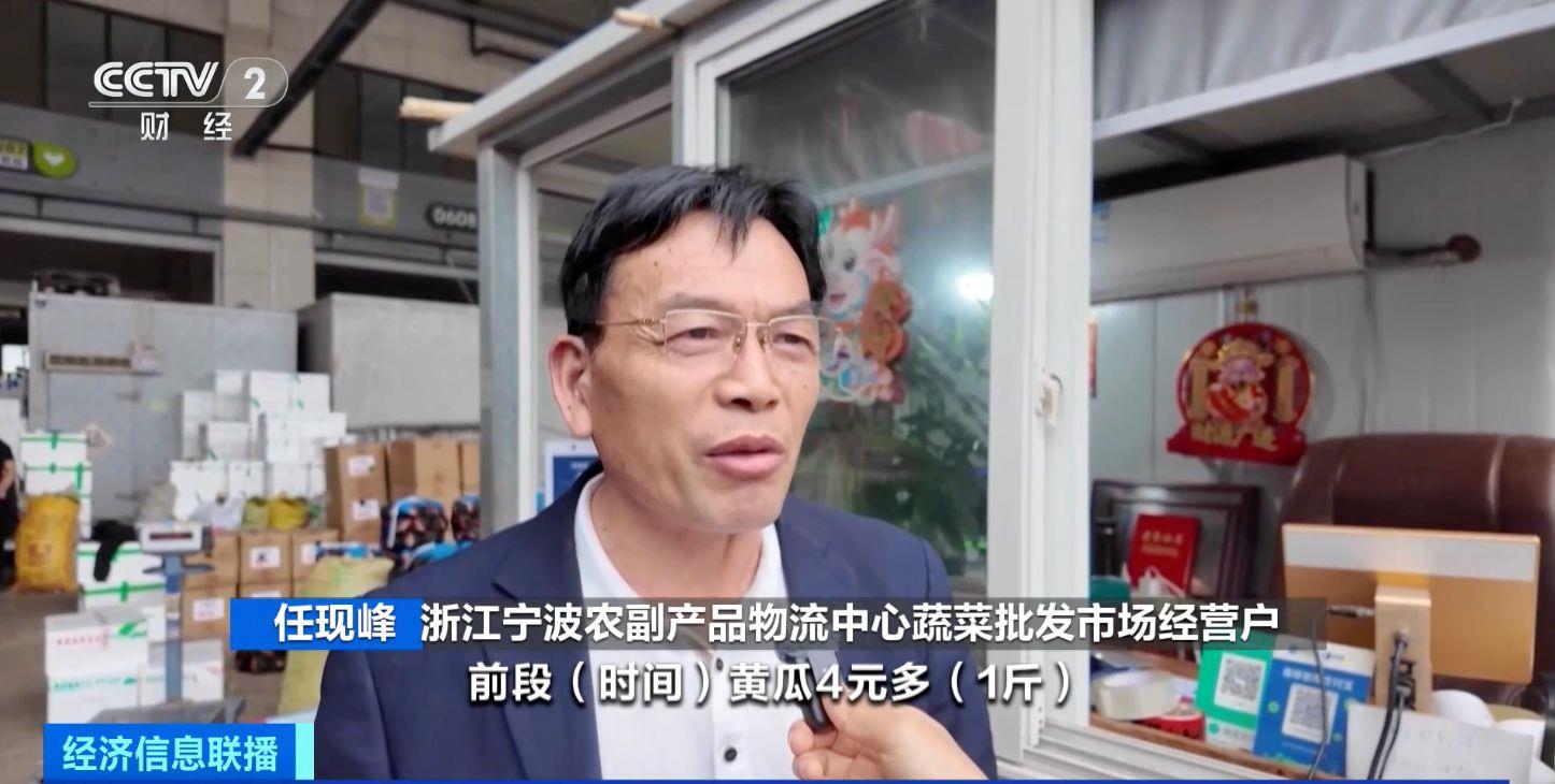 浙江寧波農(nong) 副產(chan) 品物流中心蔬菜批發市場經營戶 任現峰:黃瓜前段時間4元多一斤,現在降到2元多,降了一半。