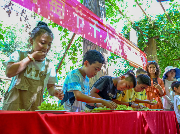遊客在新疆吐魯番葡萄溝景區參加吃葡萄大賽(8月17日攝)。新華社記者 陳朔 攝