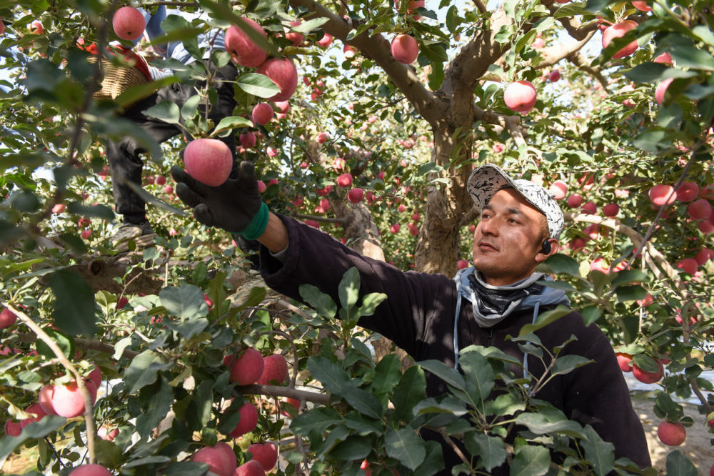 10月23日,在新疆阿克蘇地區紅旗坡農(nong) 場,果農(nong) 在采摘蘋果。新華社記者 高晗 攝