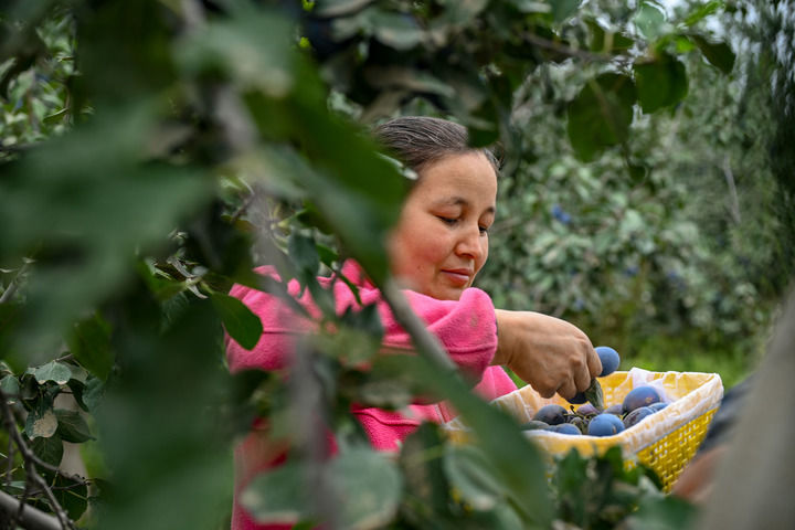 農(nong) 民在新疆昆玉市老兵鎮一家種植園內(nei) 采摘新西梅(9月4日攝)。新華社記者 陳朔 攝