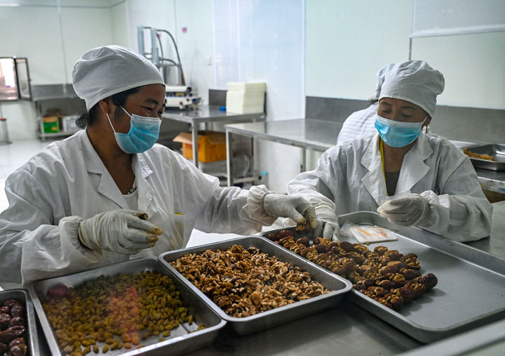 在新疆喀什地區巴楚縣一家合作社,職工在無菌車間內(nei) 製作棗夾核桃(9月8日攝)。新華社記者 陳朔 攝