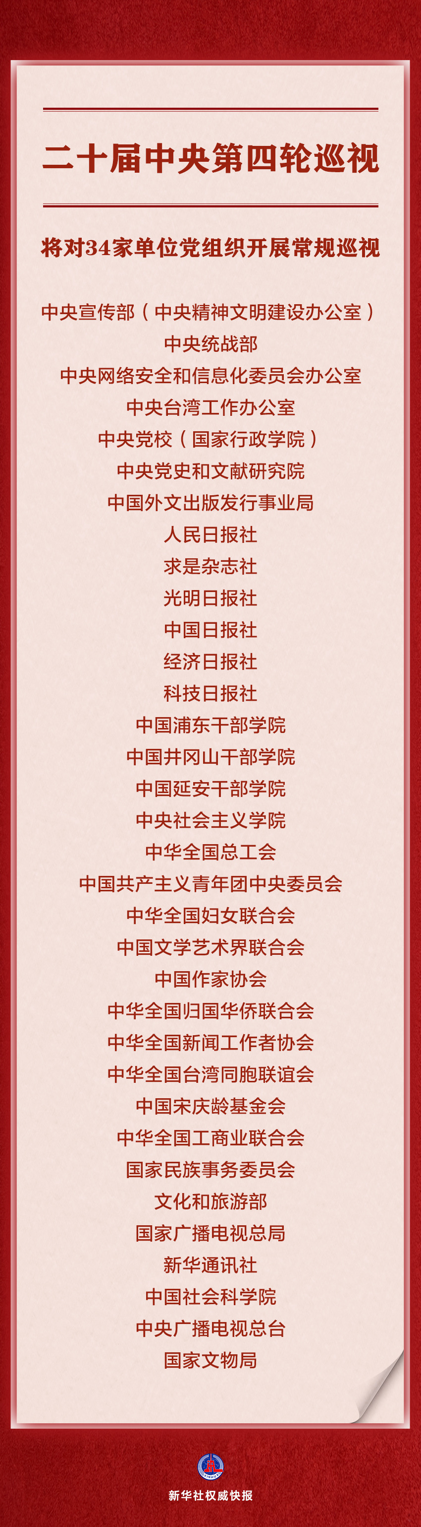 經黨(dang) 中央批準,二十屆中央第四輪巡視將對中央宣傳(chuan) 部(中央精神文明建設辦公室)、中央統戰部、中央網絡安全和信息化委員會(hui) 辦公室、中央台灣工作辦公室、中央黨(dang) 校(國家行政學院)、中央黨(dang) 史和文獻研究院、中國外文出版發行事業(ye) 局、人民日報社、求是雜誌社、光明日報社、中國日報社、經濟日報社、科技日報社、中國浦東(dong) 幹部學院、中國井岡(gang) 山幹部學院、中國延安幹部學院、中央社會(hui) 主義(yi) 學院、中華全國總工會(hui) 、中國共產(chan) 主義(yi) 青年團中央委員會(hui) 、中華全國婦女聯合會(hui) 、中國文學藝術界聯合會(hui) 、中國作家協會(hui) 、中華全國歸國華僑(qiao) 聯合會(hui) 、中華全國新聞工作者協會(hui) 、中華全國台灣同胞聯誼會(hui) 、中國宋慶齡基金會(hui) 、中華全國工商業(ye) 聯合會(hui) 、國家民族事務委員會(hui) 、文化和旅遊部、國家廣播電視總局、新華通訊社、中國社會(hui) 科學院、中央廣播電視總台、國家文物局等34家單位黨(dang) 組織開展常規巡視。