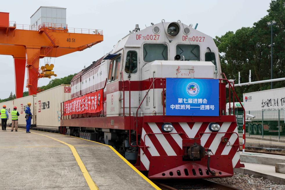 10月20日,首趟“中歐班列——進博號”抵達上海鐵路物流中心閔行貨場中儲(chu) 專(zhuan) 用線。新華社記者王翔 攝
