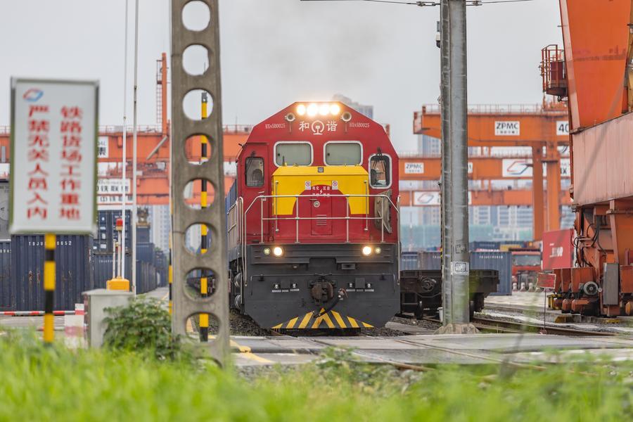 2024年7月30日,在重慶國際物流樞紐園區,一列裝載機械設備、汽車和筆記本電腦的中歐班列從(cong) 重慶團結村中心站駛出。新華社記者 黃偉(wei) 攝
