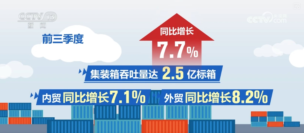 前三季度,全國港口貨物吞吐量129.7億(yi) 噸,同比增長3.4%。其中,內(nei) 貿、外貿同比分別增長1.7%和7.6%。集裝箱吞吐量達2.5億(yi) 標箱,同比增長7.7%。其中,內(nei) 貿、外貿同比分別增長7.1%和8.2%。