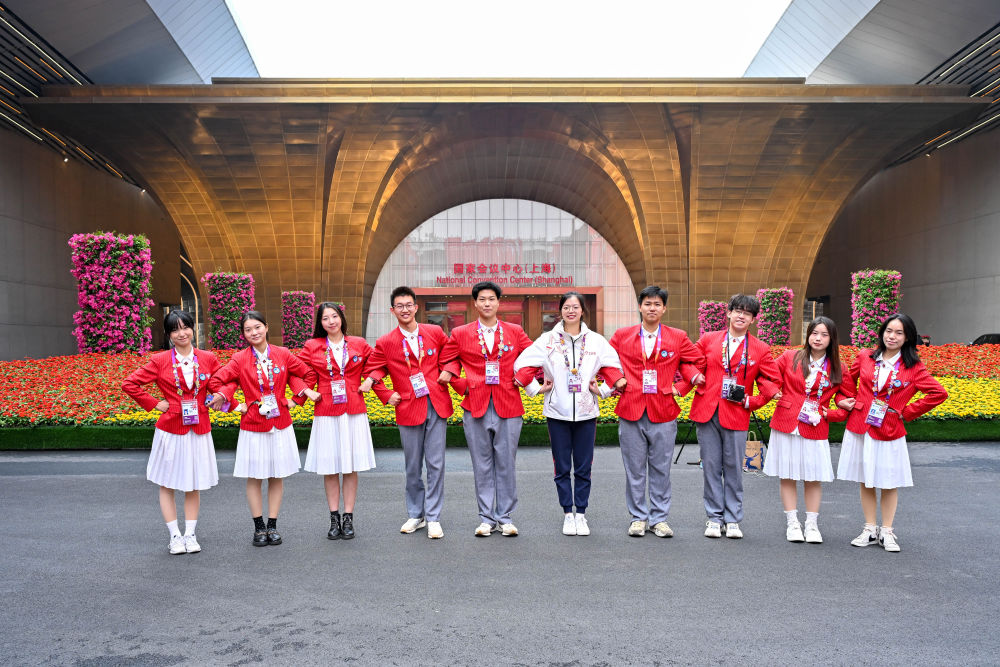 11月4日,誌願者在第七屆中國國際進口博覽會(hui) 舉(ju) 辦場地——國家會(hui) 展中心(上海)合影。
