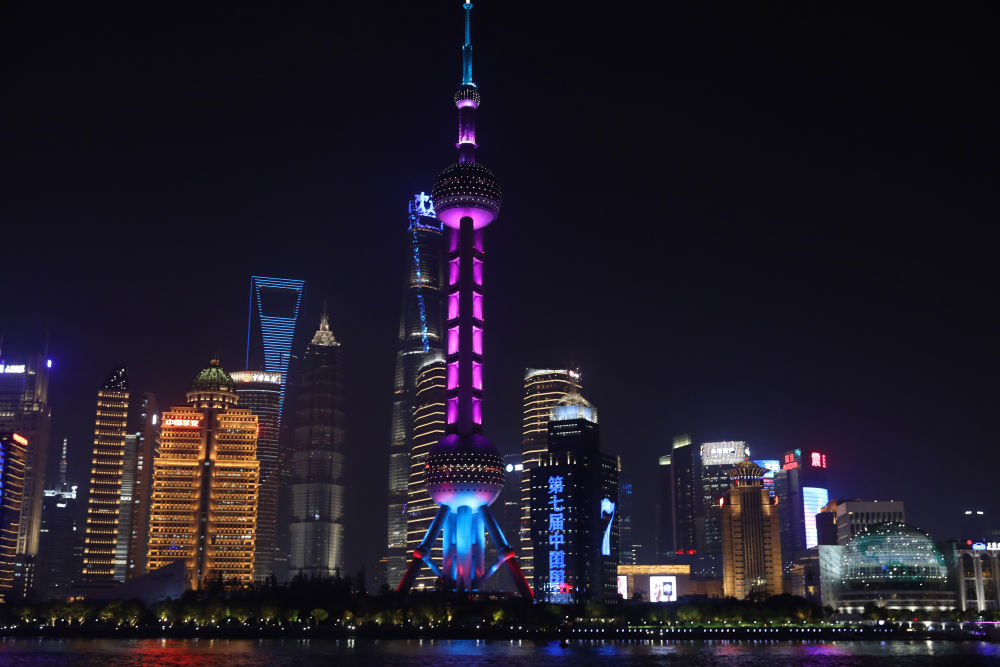 11月3日,位於(yu) 上海陸家嘴的東(dong) 方明珠廣播電視塔和大樓亮起主題燈光,迎接第七屆中國國際進口博覽會(hui) 開幕。