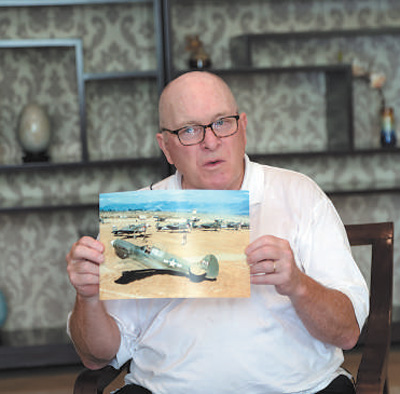小克利福德·隆展示其父親(qin) 曾駕駛的戰鬥機照片。