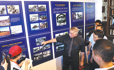 格林(左二)在長汀舉(ju) 辦的飛虎隊主題曆史圖片展上講述曆史照片背後的故事。
