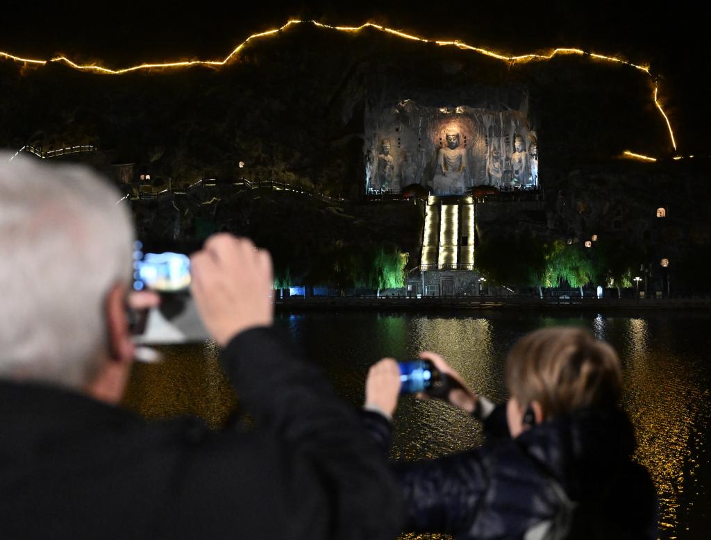 11月4日,外賓在河南省洛陽市龍門石窟景區禮佛台拍照留念。新華社記者 李嘉南 攝