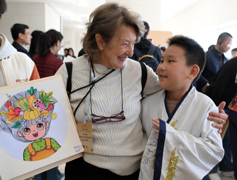 11月5日,外賓在河南省安陽市殷墟博物館與(yu) 一名小朋友交流。新華社記者 李嘉南 攝