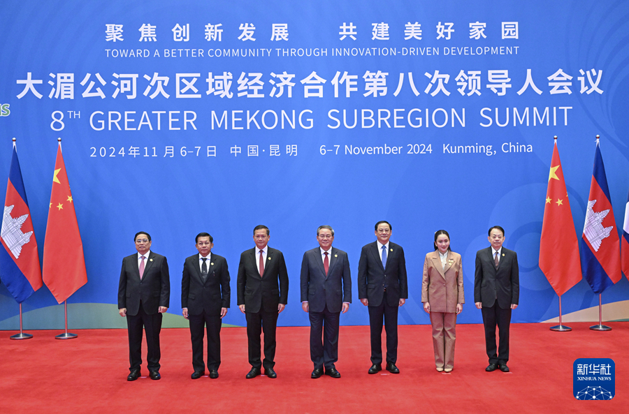11月7日,國務院總理李強在昆明出席大湄公河次區域經濟合作第八次領導人會(hui) 議。這是李強同出席會(hui) 議的柬埔寨、老撾、緬甸、泰國、越南政府首腦和亞(ya) 洲開發銀行行長合影。新華社記者 殷博古 攝