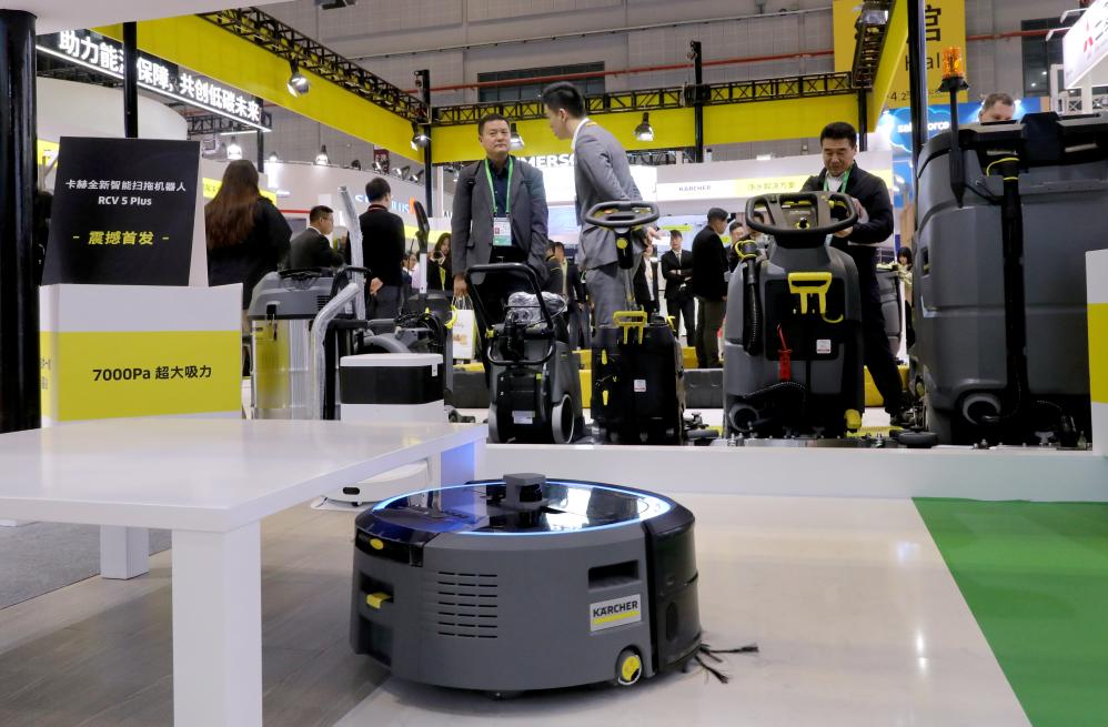 11月6日,一台卡赫全新智能掃拖機器人RCV 5 Plus(前)在進行作業(ye) 演示。這是該產(chan) 品在進博會(hui) 上的首展首發。新華社記者 方喆 攝