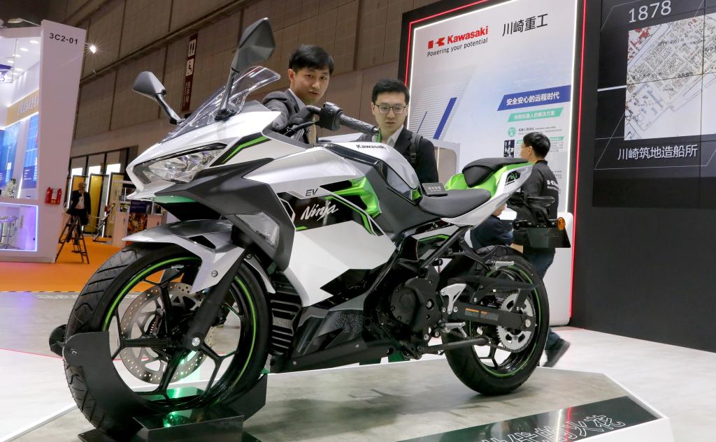 11月6日,工作人員(左)在川崎公司展台為(wei) 參觀者介紹一款電動摩托車。這是該產(chan) 品在進博會(hui) 上的首展。新華社記者 方喆 攝