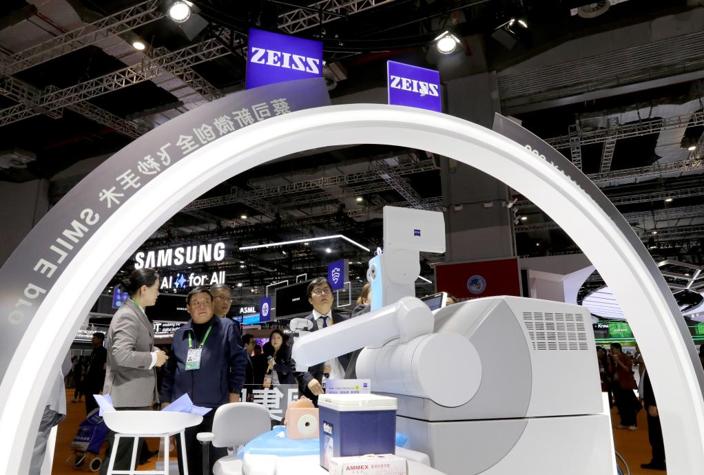11月6日,參觀者在蔡司公司展台展出的新一代機器人全飛秒前交流討論。這是該產(chan) 品在進博會(hui) 上的首展。新華社記者 方喆 攝