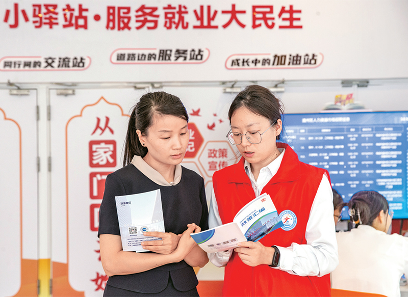 零工市場是向靈活就業(ye) 人員與(yu) 用工主體(ti) 提供就業(ye) 服務的重要載體(ti) 。圖為(wei) 2024年9月3日,江蘇省南通市通州區萬(wan) 達廣場“零工驛站”內(nei) ,就業(ye) 服務人員在向求職者介紹就業(ye) 創業(ye) 政策。人民圖片 翟慧勇/攝