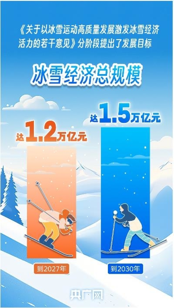 近日,國務院辦公廳公開發布《關(guan) 於(yu) 以冰雪運動高質量發展激發冰雪經濟活力的若幹意見》(以下簡稱《意見》),分階段提出發展目標:到2027年,冰雪運動場地設施更加完善,服務水平顯著提升,冰雪運動更加廣泛開展,冰雪經濟總規模達1.2萬(wan) 億(yi) 元。到2030年,冰雪經濟主要產(chan) 業(ye) 鏈條實現高水平協調融合發展,冰雪消費成為(wei) 擴大內(nei) 需的重要增長點,冰雪經濟總規模達1.5萬(wan) 億(yi) 元。