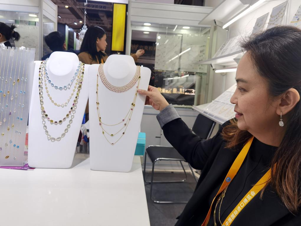 得益於(yu) 共建“一帶一路”倡議和中國-東(dong) 盟自由貿易協定的深化落實,阿拉尼婭一家的珠寶企業(ye) 有了進軍(jun) 中國廣袤市場的新計劃。這次她和家人帶來的珠寶飾品多達上百種款式,有鑲嵌紅寶石、祖母綠、碧璽等的項鏈、手鏈、戒指、吊墜等,吸引采購方駐足。