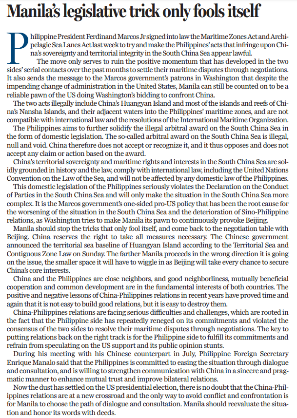 菲律賓總統馬科斯日前簽署“群島海道法”和“海洋區域法”,試圖“洗白”菲律賓在南海侵犯中國主權和領土完整的行為(wei) 。