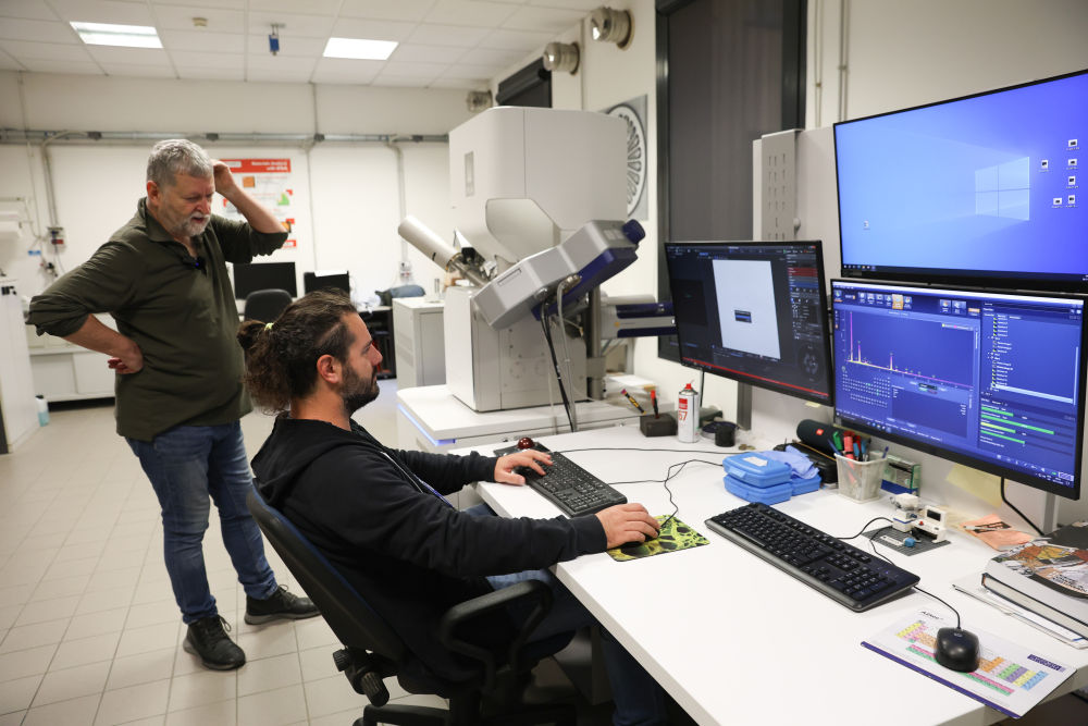 11月6日,意大利帕多瓦大學文化遺產(chan) 學院教授馬西莫·維達萊(左)與(yu) 研究人員在實驗室討論青銅獅樣本檢測分析過程。新華社記者李京攝