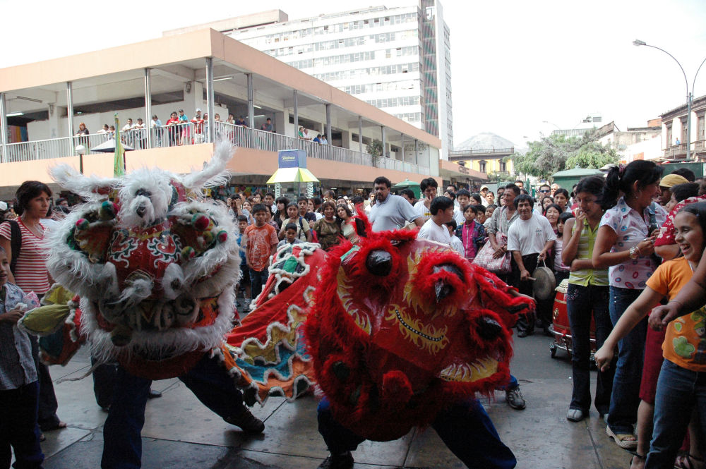 2006年1月28日農(nong) 曆除夕當天,華僑(qiao) 舞獅團在秘魯利馬唐人街上舞獅拜年。