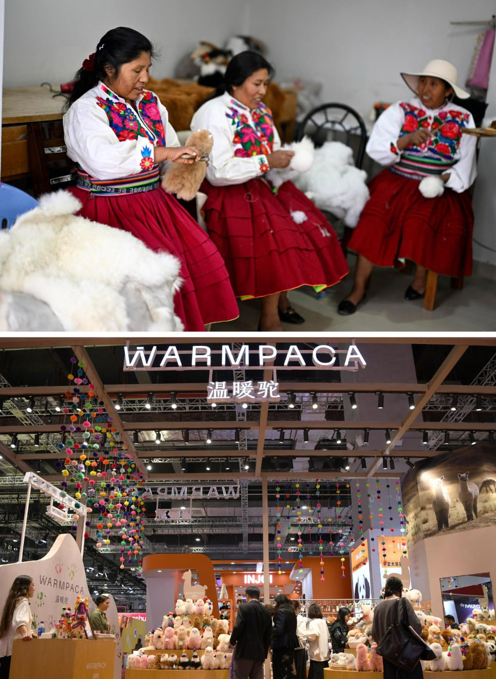 2016年,中國姑娘馬玉霞在秘魯阿雷基帕街邊市場購買(mai) 了秘魯羊駝毛製品手工藝人奧斯瓦爾多·馬馬尼的羊駝毛玩偶並引入中國市場。通過連續參展進博會(hui) ,羊駝毛製品在中國市場大受歡迎,並創立了中文品牌“溫暖駝”。今年,秘魯品牌“溫暖駝”連續第七年亮相進博會(hui) ,受到更多中國消費者的喜愛。目前,“溫暖駝”品牌已入駐國內(nei) 30多家商場,並且開拓了電商平台線上銷售,年銷量超過3萬(wan) 隻。上圖:2024年6月20日,在秘魯阿雷基帕,工作人員在羊駝毛製品手工藝人奧斯瓦爾多·馬馬尼的工坊製作羊駝玩偶。下圖:2024年11月5日在上海拍攝的第七屆進博會(hui) 秘魯“溫暖駝”展台。