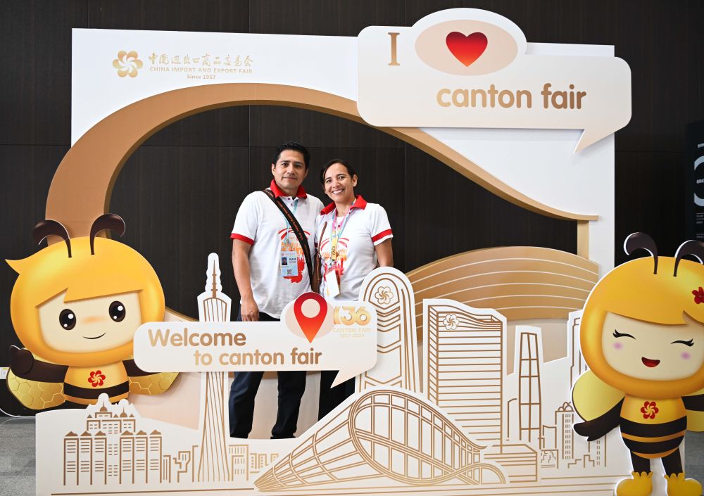2024年10月15日,來自秘魯的采購商在廣州舉(ju) 行的廣交會(hui) 上合影留念。