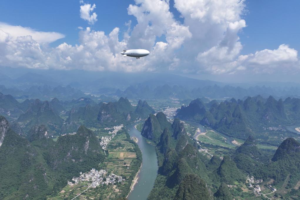 9月14日,“祥雲(yun) ”AS700載人飛艇在廣西陽朔進行演示飛行(無人機照片)。新華社發(中國航空工業(ye) 集團特種飛行器研究所供圖)