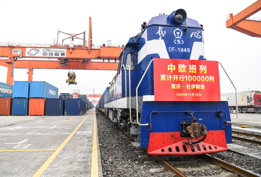 11月15日,第10萬(wan) 列中歐班列——X8083次中歐班列(重慶—杜伊斯堡)在重慶團結村中心站準備發車。新華社記者 王全超 攝