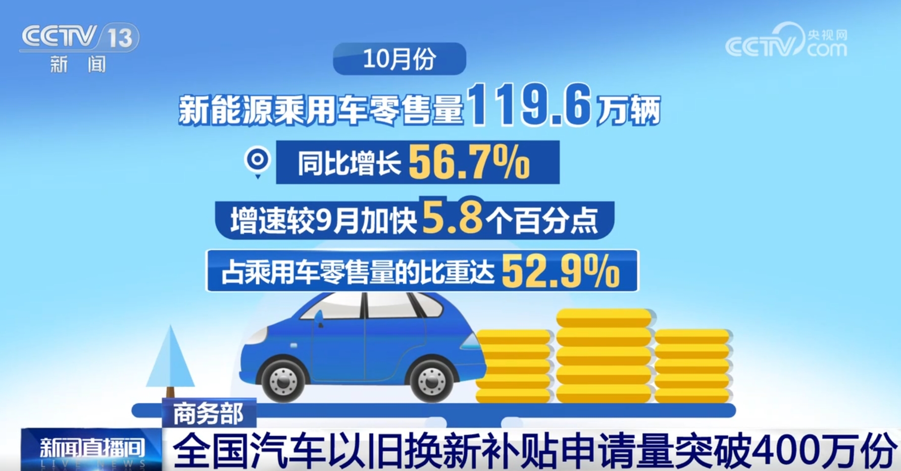 商務部數據顯示,截至11月18日24時,全國汽車報廢更新和置換更新補貼申請均突破200萬(wan) 份,兩(liang) 者合計超過400萬(wan) 份。