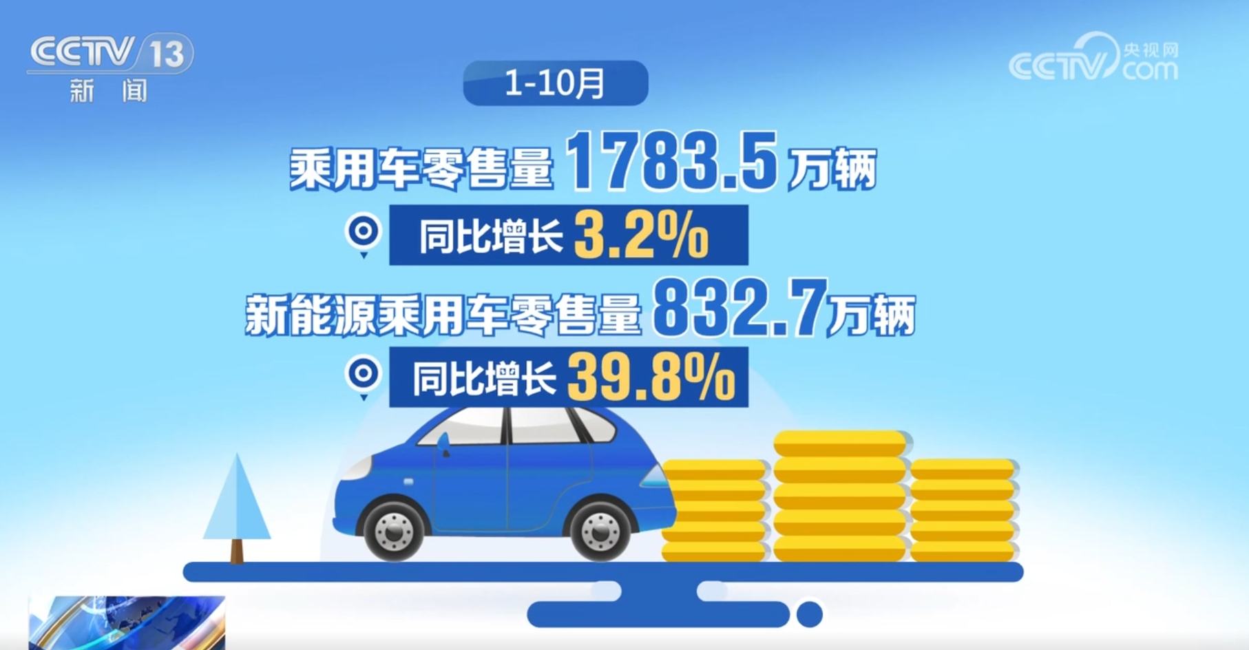 在以舊換新政策的帶動下,汽車銷量也有了明顯增長。10月份,乘用車零售量226.1萬(wan) 輛,同比增長11.3%,增速較9月加快6.8個(ge) 百分點。其中,新能源乘用車零售量119.6萬(wan) 輛,同比增長56.7%,增速較9月加快5.8個(ge) 百分點,占乘用車零售量的比重達52.9%。1—10月,乘用車零售量1783.5萬(wan) 輛,同比增長3.2%。其中,新能源乘用車零售量832.7萬(wan) 輛,同比增長39.8%。