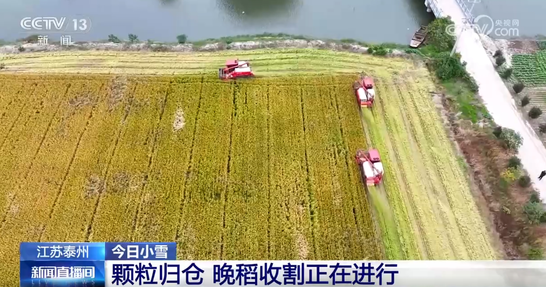我們(men) 現在看到的是江蘇泰州正在進行的晚稻收割作業(ye) 。這個(ge) 時候,當地早稻和中稻已經收獲完成,收割機正開足馬力進行晚稻收獲,割穗、脫粒、粉碎秸稈,一氣嗬成,連倒伏的稻穗也被采收幹淨,金黃飽滿的稻穀順著管道傾(qing) 瀉而下,顆粒歸倉(cang) 。