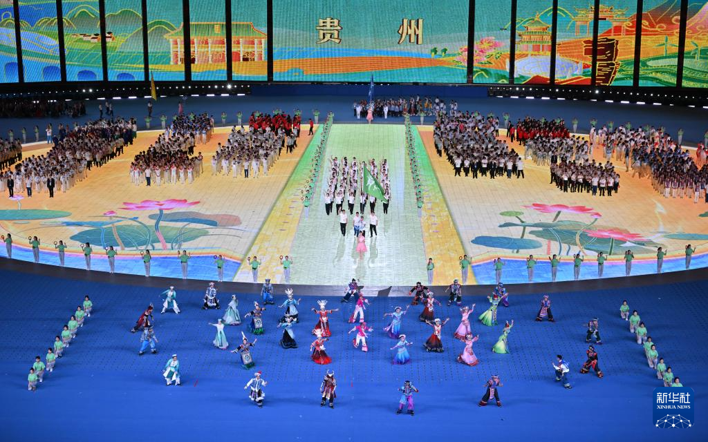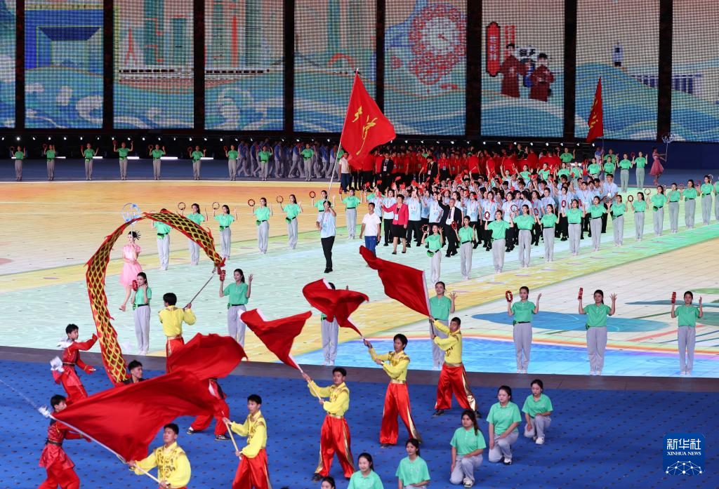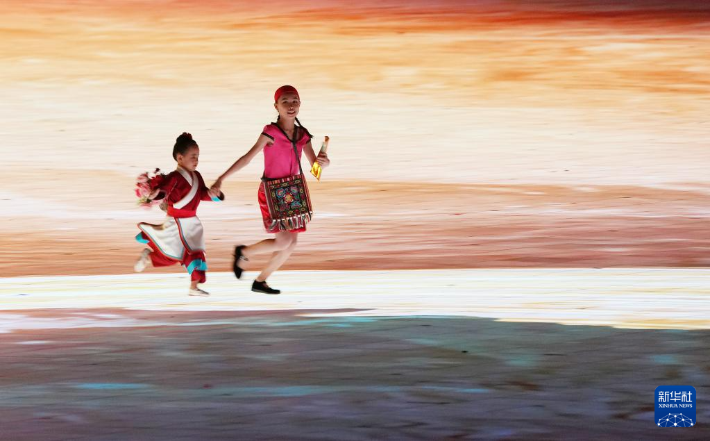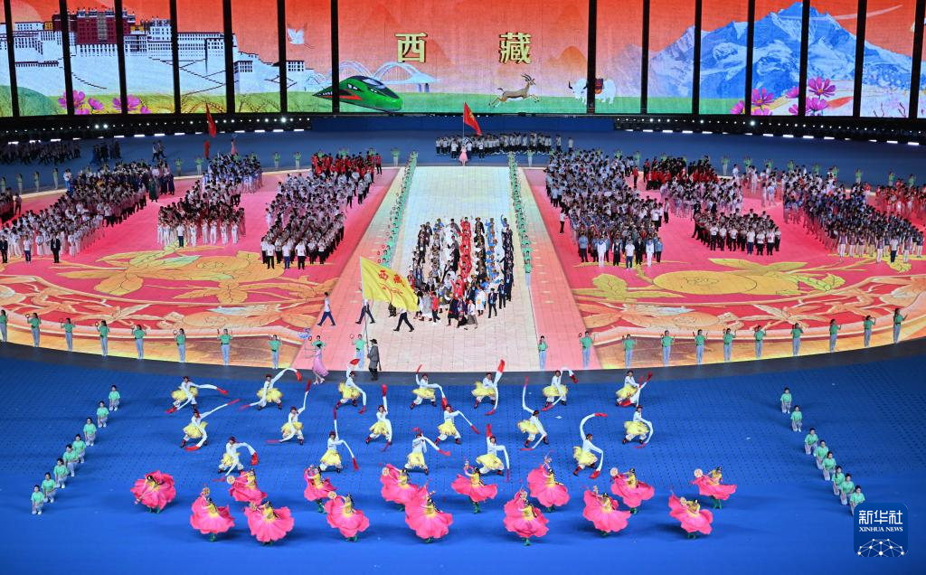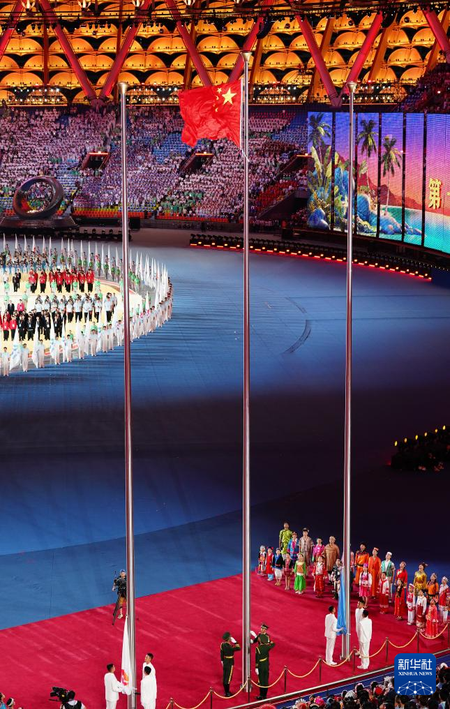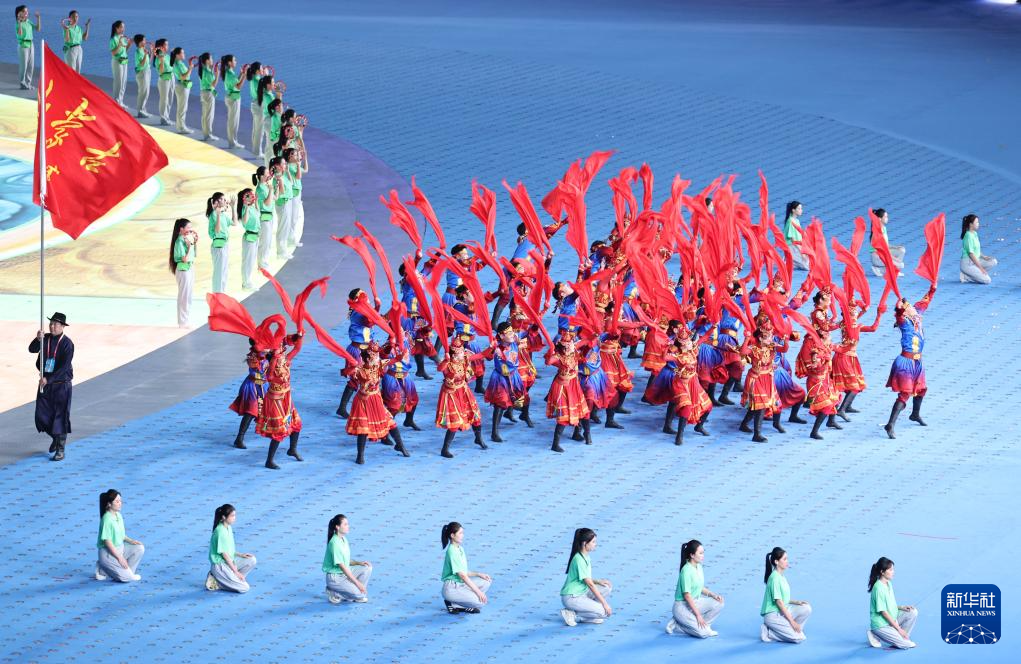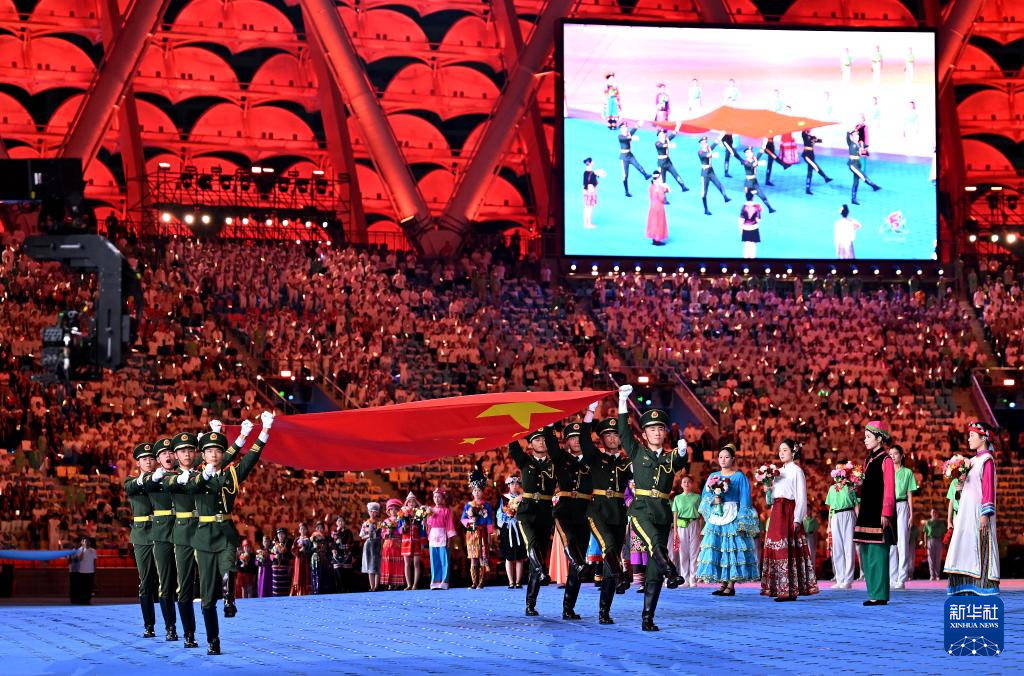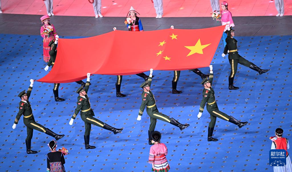 11月22日,中華人民共和國國旗、中華人民共和國少數民族傳(chuan) 統體(ti) 育運動會(hui) 會(hui) 旗和中華人民共和國第十二屆少數民族傳(chuan) 統體(ti) 育運動會(hui) 會(hui) 旗在開幕式上飄揚。
