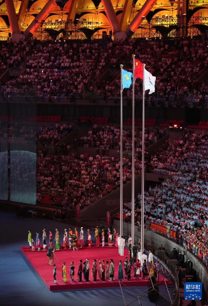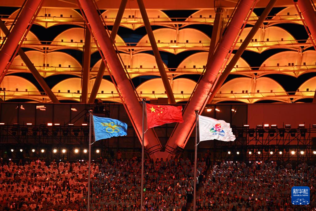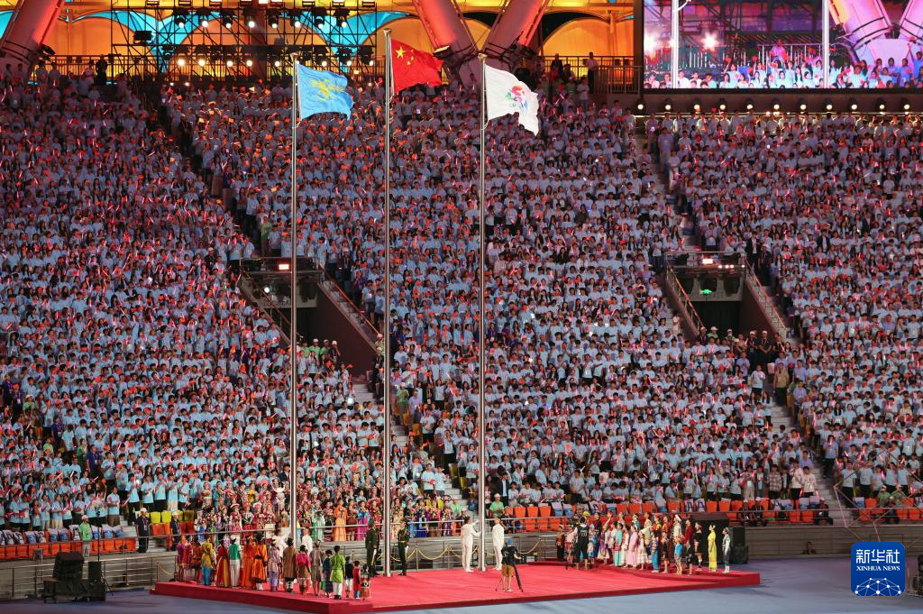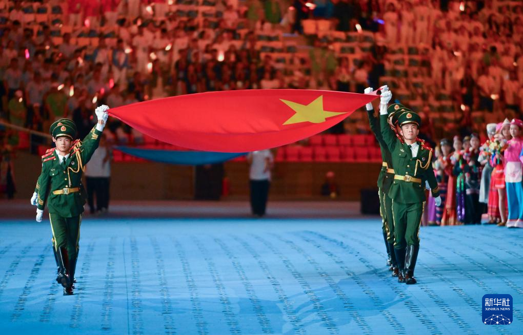 11月22日,開幕式現場升起中華人民共和國國旗、中華人民共和國少數民族傳(chuan) 統體(ti) 育運動會(hui) 會(hui) 旗和中華人民共和國第十二屆少數民族傳(chuan) 統體(ti) 育運動會(hui) 會(hui) 旗。