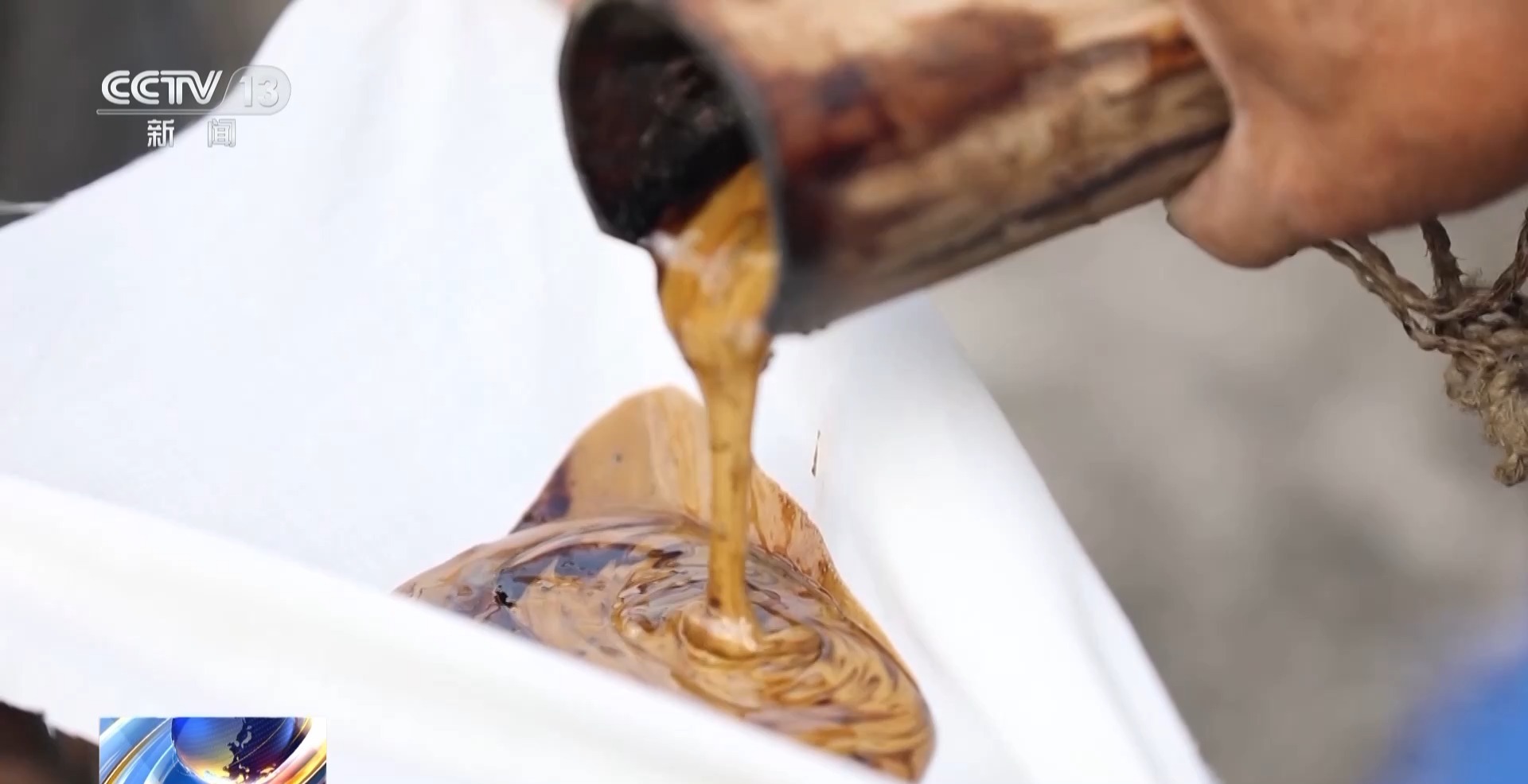 收割來的生漆,經過濾渣、熬製、冷卻與(yu) 桐油混合之後才能使用。