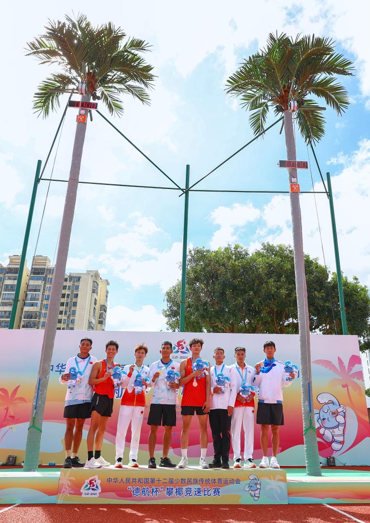 11月24日,獲獎選手在頒獎儀(yi) 式上合影。當日,第十二屆全國少數民族傳(chuan) 統體(ti) 育運動會(hui) 攀椰競速男子9米決(jue) 賽在西南大學三亞(ya) 中學體(ti) 育場舉(ju) 行。新華社記者 楊植森 攝