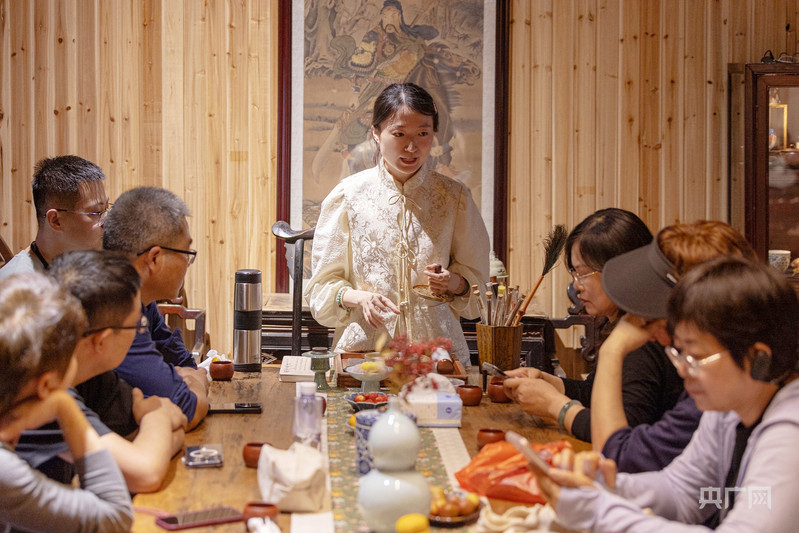 在倒扒獅街,“90後”安慶姑娘秦無顏是一家文化主題會(hui) 館的主理人。在她的會(hui) 館裏,檀木、玉石等製作而成的新中式文玩飾品、傳(chuan) 統工藝麵料製作而成的“新中式”服裝、古色古香的“新中式”茶館,定期舉(ju) 行的雅集活動……無一不體(ti) 現著獨特的東(dong) 方美學。2020年,在上海從(cong) 事珠寶設計工作的她返回家鄉(xiang) 經營起這家文化空間。“既逐新,也尋根。”她希望,客人來到這裏,放慢腳步,在交流與(yu) 體(ti) 驗中感受傳(chuan) 統文化的魅力,豐(feng) 富精神體(ti) 驗。