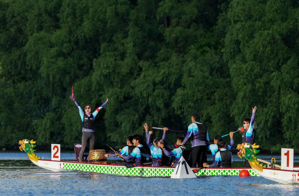 11月25日,雲(yun) 南隊在決(jue) 賽後慶祝。最終雲(yun) 南隊獲得一等獎。當日,第十二屆全國少數民族傳(chuan) 統體(ti) 育運動會(hui) 混合組(小龍舟)500米直道賽在海南省三亞(ya) 市舉(ju) 行。新華社發(杜笑微攝)