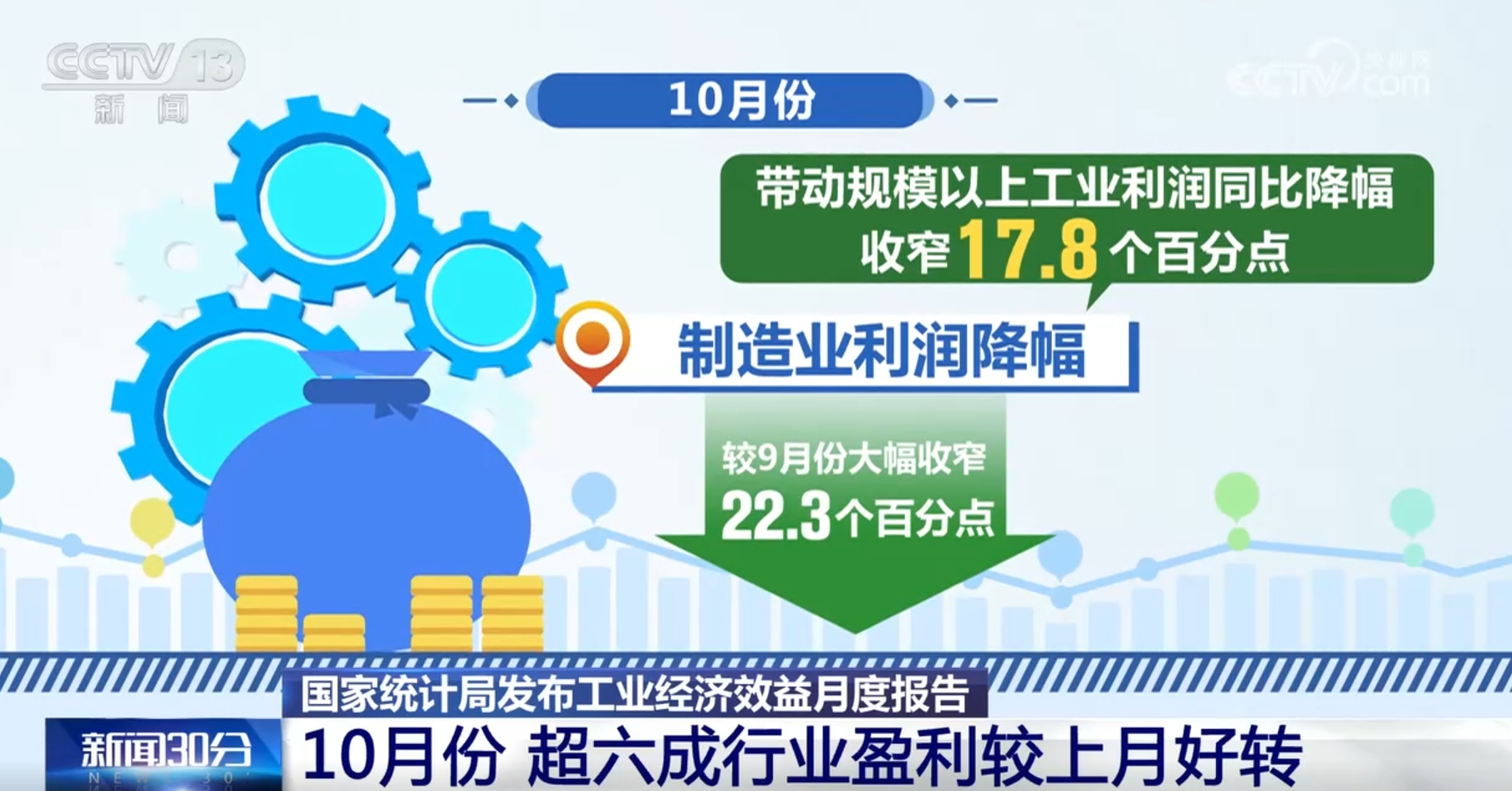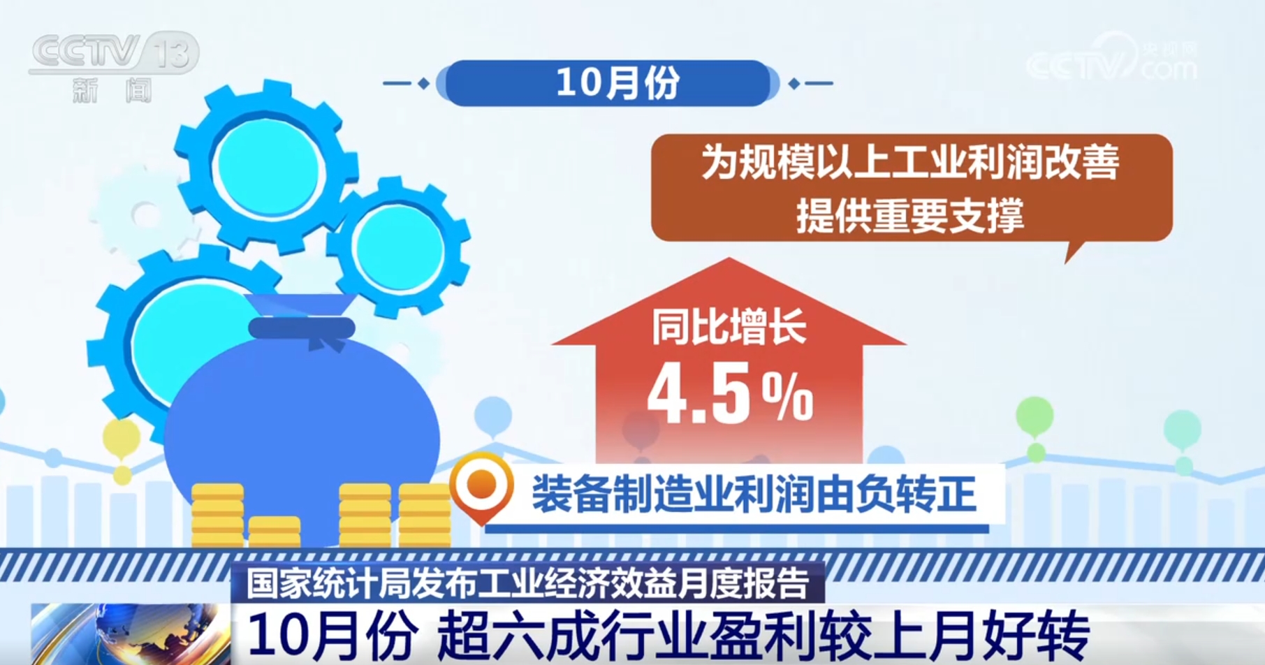 國家統計局最新發布的數據顯示,10月份,隨著存量政策及一攬子增量政策協同發力、持續顯效,規模以上工業(ye) 企業(ye) 生產(chan) 穩定增長,企業(ye) 利潤當月降幅明顯收窄,多數行業(ye) 盈利較上月好轉。