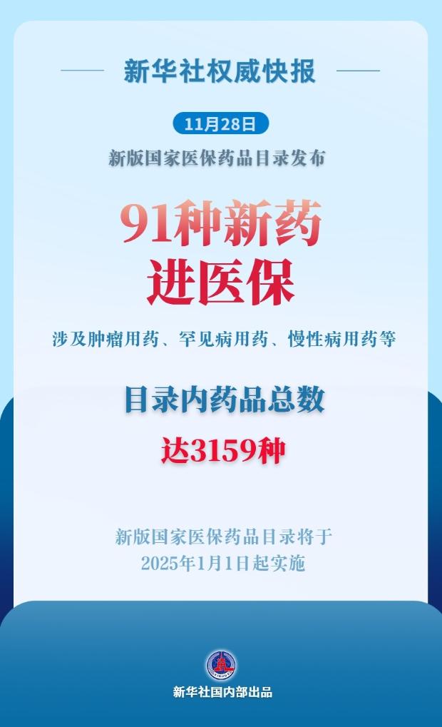 自成立以來,國家醫保局已連續7年開展醫保藥品目錄調整工作。本次調整後,目錄內(nei) 藥品總數將增至3159種,腫瘤、慢性病、罕見病、兒(er) 童用藥等領域的保障水平得到提升。新版國家醫保藥品目錄將於(yu) 2025年1月1日起實施。