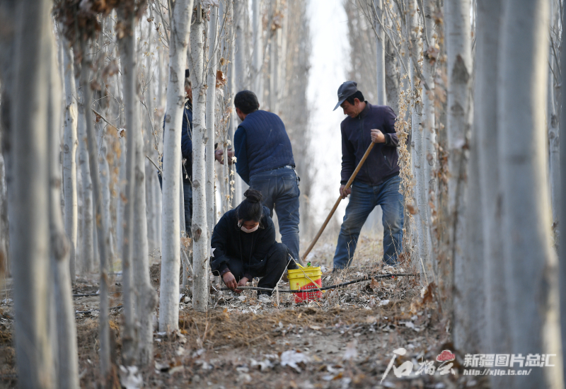 11月28日,護林員在葉城縣20萬(wan) 畝(mu) 生態林基地管護白楊樹。